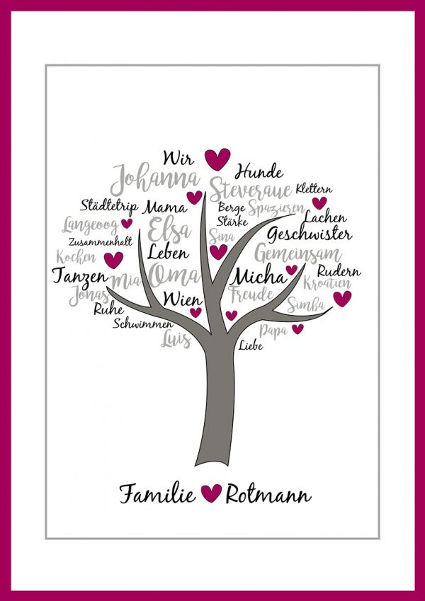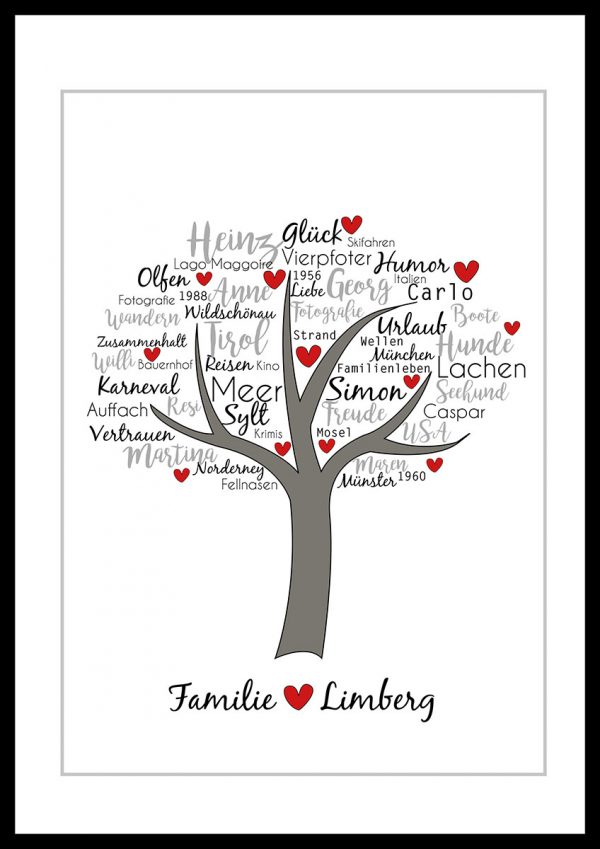 Hochzeit, Geburt, Taufe, Geburtstage oder einfach mal so. Jedes Bild wird individuell erstellt und vor dem Druck mit euch besprochen. Änderungswünsche sind dann noch möglich. Lasst mir einfach 15-20 Wörter zukommen, die euch als Familie unverwechselbar machen. Hierzu zählen Namen, Geburtsdaten, Wohnorte, besondere Erlebnisse, Hobbys, Reiseziele, Wünsche … Das Motiv erhaltet ihr als DIN A4 (matten oder hochglänzenden) Print auf hochwertigem Fotopapier. A4 Print = 55,00 € inkl. MwSt. (ohne Rahmen). Andere Formate sind natürlich auf Anfrage möglich.